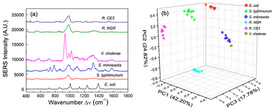 Different enteric LPS Raman SERS spectra. (a) SERS spectra of different enteric LPSs obtained from E. coli, S. typhimurium, S. minnesota, V. cholerae, R. CE3, and R. NGR. (b) PCA score plot of six enteric LPSs based on their SERS spectra.