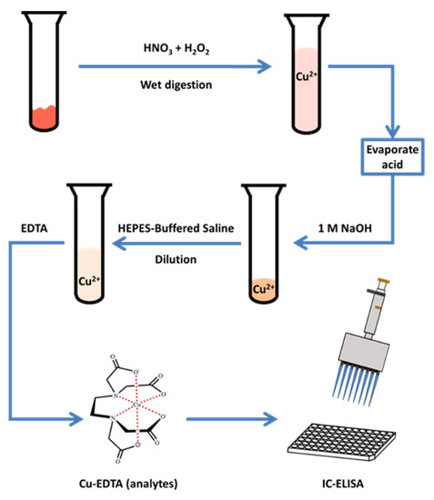 Although there exist a few examples of immunoassays for the detection of Cu, they focus on simple substrates such as water. Few immunoassays have been developed for meat, liver, and other complicated food substrates. Therefore, in this study, we developed an immunoassay for the detection of Cu in animal samples. The Cu ions in animal tissue samples were extracted and chelated with ethylenediaminetetraacetic acid (EDTA), and the resulting complex was detected with an ELISA method (Figure 1). Then, local meat and swine samples with inorganic Cu supplements were tested to determine the reliability and portability of the newly developed immunoassay.
