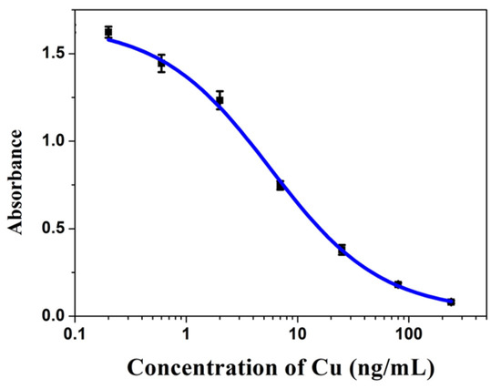 So far, many methods of detecting copper in liver, serum, and pork have been established. Some previously reported studies showed the LOD of Cu was 0.022 (ICP-MS) [52] and 0.5 mg/kg (ASS) [24] in liver and meat. Compared with other conventional techniques, this immunoassay has the advantage of low LOD. Moreover, the microplate of the ic-ELISA method makes the assay a high-throughput analysis, which compresses time for the detection of a large number of samples at the same time.