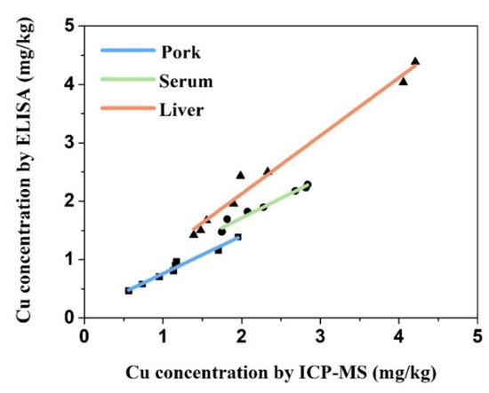 To evaluate the practicality and accuracy of our ic-ELISA method, pig samples spiked with three concentrations of Cu (II) were analyzed, which followed the same process shown in Figure 1. As shown in Table 2, the Cu recovery from pork samples ranged from 94.53 to 102.24%, and the coefficients of variance (CV) were from 2.63 to 9.53%. The results show that the test had stable recovery and reproducibility. Furthermore, the performance of the immunoassay was evaluated by comparing it with ICP-MS detection. Three types of samples (pork, serum, and liver) were treated and analyzed. As a result, we developed a linear regression model for correlation analysis of the ELISA and ICP-MS methods (Figure 3). The correlation coefficient was 0.967 for pork, 0.976 for serum, and 0.983 for liver, indicating high reliability of this ic-ELISA method.