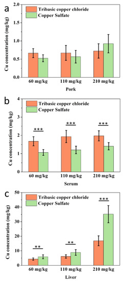 According to previously published data, Cu in fodder is absorbed into the blood through the intestinal tract, and mainly conjugates with plasma proteins. Cu intake by livestock is distributed in erythrocytes and plasma, and mainly manifests in the form of erythrocyte cupratin and ceruloplasmin [54,55,56,57]. When Cu overdose occurs, it is transported to the liver for storage, which results in the bioaccumulation of Cu in vivo [58,59,60]. The Cu concentrations in tissue and liquid samples indicated that the liver was a target organ and was sensitive to changes in dietary Cu content (Figure 4). Therefore, liver Cu levels could be used as a sensitive index of excessive Cu in pig products. The data show that the two inorganic Cu-sourced feed supplements underwent different metabolic pathways in animals (Supplementary Material Table S1). Therefore, an assessment of dietary Cu supplements in animals should be carried out to more fully understand its bioavailability [61,62].