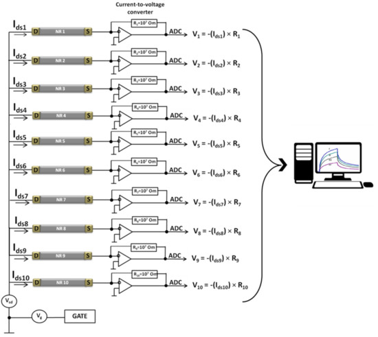 Electrical measurements were performed with the use of a 10-channel data collection and storage system (Agama + JSC, Moscow, Russia). During the measurements, the substrate of SOI structures was used as a gate. The current flowing through the NRs was transduced into voltage with the use of current-to-voltage transducers, then digitized with an analog-to-digital converter, and displayed on the monitor of a personal computer (Figure 3).