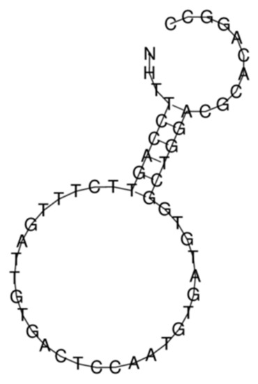 The thermodynamic characteristics of this structure are as follows: the free energy of the thermodynamic ensemble is −10.43 kcal/mol; the frequency of the MFE structure in the ensemble is 7.06%; and the ensemble diversity is 14.76.