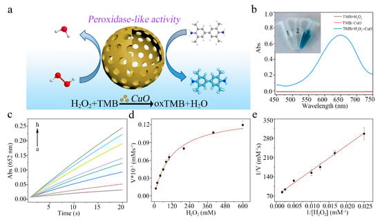 To investigate the peroxidase-like activity of mesoporous CuO hollow spheres, a typical reaction of the catalytic oxidation of 3,3′,5,5′-tetramethylbenzidine (TMB) in the presence of H2O2 was adopted. As depicted in Figure 2a, Cu-TA-350 can catalyze the oxidation of TMB to form oxidized TMB (oxTMB). Mesoporous CuO hollow spheres can break the O-O bond of H2O2, producing two·OH, while TMB can be oxidized by ·OH to form oxTMB. The colorless mixture of TMB and H2O2 changed to a blue solution after adding Cu-TA-350. In contrast, negligible absorbance was observed in the presence of TMB and H2O2 (Figure 2b). It could be observed that Cu-TA-350 has enzymatic activity, while Cu2+ plays a role in enzymatic catalysis (Figure S2). These results successfully identified the peroxidase-like activity of Cu-TA-350 rather than the leached Cu2+. Meanwhile, the absorbance of the system at 652 nm noticeably increased as the reaction proceeded over 5 min (Figure S3a). The absorbance value increased gradually when more Cu-TA-350 was used. Therefore, Cu-TA-350 dispersed solution was selected for the following experiments. In addition, similar to the natural enzyme, the effects of the concentration of TMB, pH value and temperature on peroxidase-like activity of Cu-TA-350 were investigated. The absorbance gradually increased when the concentrations of TMB increased (Figure S3b). The peroxidase activity of Cu-TA-350 was best achieved at a pH value of 5.0 (Figure S3c) or at a temperature of 40 °C (Figure S3d). In the buffer solution with a pH of 5, Cu-TA-350 may show enhanced interaction with TMB molecules, promoting the catalytic oxidation of TMB with H2O2 [54].