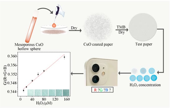 Mesoporous metal oxide hollow spheres exhibit a tunable pore size (2–50 nm), a large specific surface area, tailorable compositions, highly accessible pore channels and shortening mass transfer pathways. They have attracted broad applications in catalysis, sensors, energy conversion and storage [43,44]. When mesoporous metal oxide hollow spheres are used for nanozyme and paper-based sensors, they demonstrate several advantages. Firstly, mesoporous metal oxide hollow sphere nanozymes have a large specific surface area and a large number of accessible active sites [45,46]. Such active sites would facilitate the catalytic reaction on the surface of nanozyme and increase the sensitivity. Secondly, mesoporous metal oxide hollow sphere nanozymes show interconnected mesoporous channels, large pore sizes and a uniform diameter, which can favor mass transfer and thus enable fast detection [47,48]. Thirdly, mesoporous metal oxide hollow sphere nanozymes have large internal voids that can load other guests, such as enzymes, metal nanoparticles and reporter molecules [49,50]. Due to the flexibility of mesoporous structure and compositions, mesoporous metal oxide hollow sphere nanozymes have many applications in biosensors, antibacterial drug delivery and therapy. Until now, there has been no report on the synthesis of mesoporous CuO hollow sphere nanozymes for paper-based H2O2 sensors.