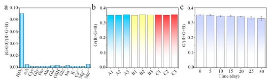 To the best of our knowledge, the detection of H2O2 using a mesoporous CuO hollow sphere-based paper sensor has not yet been explored. Further study was also performed on the selectivity of the paper-based sensor for H2O2 detection. The paper-based sensor showed no obvious response in absence of H2O2 (Figure 5). This result demonstrated that the paper-based sensor had good selectivity of H2O2 (Figure 5a). Nine repeated experiments showed that the paper-based sensor had good repeatability (Figure 5b). Furthermore, the paper-based sensors can be stored for at least one month at 25 °C in a sealed bag (Figure 5c). These results demonstrated that the paper-based sensor showed excellent performance and could potentially be applied in practical applications.