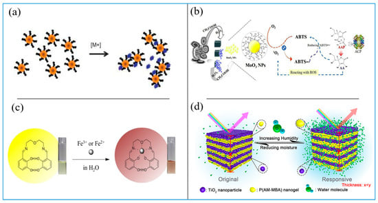 (a) Schematic illustration of the aggregation of peptide-functionalized nanoparticles (PFNs) in the presence of metal ions [M+]. Reprinted with permission from Ref. [33], Copyright 2008, Wiley-VCH. (b) Principle of ACP determination based on the oxidase-mimicking property of MoO3NPs. Reprinted with permission from Ref. [35], Copyright 2020, Elsevier. (c) Colorimetric Detection Mechanism of chelated Schiff base for Fe2+ and Fe3+. Reprinted with permission from Ref. [36], Copyright 2015, Elsevier. (d) Illustration of response of the 1DPC sensor to water vapor: the original 1DPC and the responsive 1DPC. Reprinted with permission from Ref. [37], Copyright 2018 American Chemical Society.