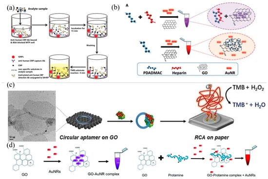 Graphene can be functionalized based on the adsorption capacity of graphene to protein and nucleic acids to obtain a higher specificity of graphene-based materials. By means of KOH pretreatment, Vashist and colleagues covalently linked a graphene nano-platelet (GNP) to a polystyrene microtitration plate (MTP) using silane coupling agent APTES to synthesize a colorimetric sensing platform rich in human C-reactive protein (CRP) antibodies [55]. As shown in Figure 2a, the analytical sample is dripped onto GNP/MTP, and after incubation at 37 °C for 15 min, CPR binds with antibodies to make GNP/MTP have catalytic oxidation activity, resulting in a significant color change in TMB.