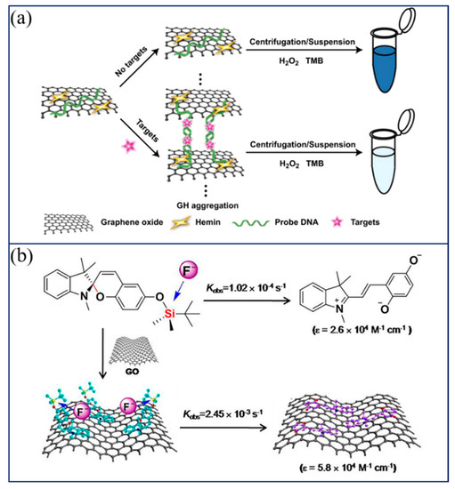 It has been reported that some analytes, including metallic ions, DNA, and other small molecules, can be detected by combining hemin-modified GO with a DNA probe [61]. As shown in Figure 3a, hemin is bound to graphene by the DNA-mediated synthesis method, and different optical signals are generated according to the concentration of targets, so as to achieve a simple and fast colorimetric detection of various analytes.
