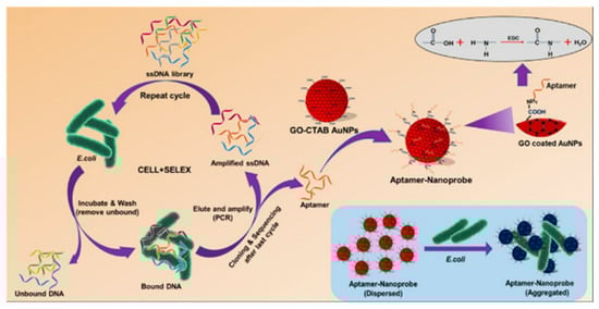 Colorimetric detection of Escherichia coli with GO-coated AuNPs and binding of aptamer. Reprinted with permission from Ref. [18], Copyright 2021, Elsevier.