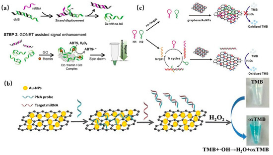Zhao et al. developed a label-free colorimetric sensor for miRNA detection based on the spontaneous adsorption of PNA-21 on a graphene/AuNP hybrid surface. As shown in Figure 6b, the accumulation between the PNA probe and graphene completely inactivates the peroxidase-like catalysis of the graphene/AuNP, which greatly decreases the catalytic oxidation of TMB by H2O2. Therefore, the addition of miRNA triggered the hybridization reaction between ssPNA-21 and miRNA, which caused PNA to be released from graphene/AuNP, restoring the catalytic activity of graphene/AuNP, accompanied by a colorless to blue color change [69].