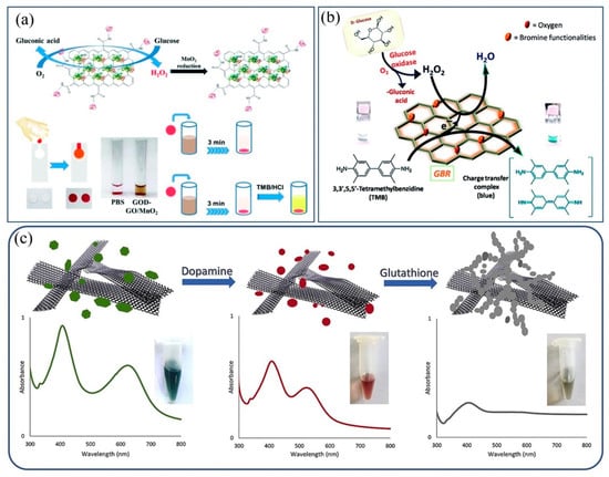 Colorimetric sensing of small molecules with 2D materials: (a) oxidase-graphene oxide/manganese dioxide (GOD-GO/MnO2) direct colorimetric determination of glucose concentration. Reprinted with permission from Ref. [74], Copyright 2019, Royal Society of Chemistry. (b) Plausible mechanism of glucose detection. Reprinted with permission from Ref. [75], Copyright 2017, Royal Society of Chemistry. (c) Graphene/silver hybrid material colorimetric detection of dopamine (DA) and glutathione (GSH). Reprinted with permission from Ref. [22], Copyright 2020, Elsevier.