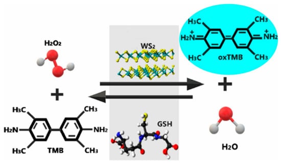 Li et al. developed a colorimetric sensing platform based on WS2 based on the inhibitory effect of GSH on the nanozymatic catalytic activity of WS2 [78]. Figure 8 shows the sensing mechanism of the fabricated sensing platform, in which WS2 has the ability to oxidize TMB to turn the solution to blue. When GSH is present in the solution, it reacts with the TMB oxidation product to reduce the color of the solution, showing a change from blue to light blue and to colorless, thus achieving the purpose of colorimetric detection of GSH.