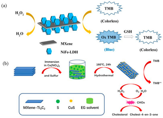 Li and co-workers demonstrated the synthesis of CuS–Ti3C2 hybrids by the hydrothermal synthesis of CuS NPs on Ti3C2 nanosheets [88]. The formed CuS–Ti3C2 hybrids had improved peroxidase-like activity compared to both CuS NPs and Ti3C2 nanosheets, revealing a potential application for the fabrication of colorimetric biosensors of cholesterol (Figure 9b). CuS–Ti3C2 can catalyze the oxidation of TMB by H2O2, and the solution color is different and the absorbance is different under different H2O2 concentrations. The colorimetric determination of H2O2 from the oxidation products of cholesterol can indirectly achieve the detection purpose according to the color of the solution.