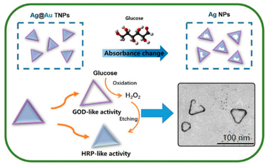 - Liu, A.; Li, M.M.; Wang, J.X.; Feng, F.; Zhang, Y.; Qiu, Z.W.; Chen, Y.Z.; Meteku, B.E.; Wen, C.Y.; Yan, Z.F.; et al. Ag@Au core/shell triangular nanoplates with dual enzyme-like properties for the colorimetric sensing of glucose. Chin. Chem. Lett. 2020, 31, 1133–1136. [Google Scholar] [CrossRef]