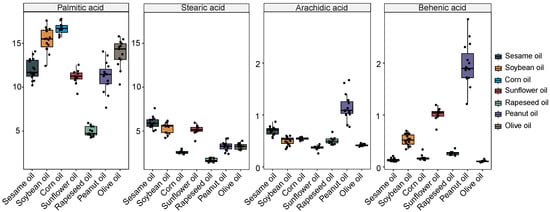 First, the statistical analysis of quantitative results of four fatty acids were shown in Table 1 and Figure 3. For the palmitic acid, except rapeseed oil, the other six kinds of edible oils were detected with high contents. The corn oil was rich in palmitic acid (mean = 16.67%, standard deviation (sd) = 0.68) compared to other oils. The rapeseed oil had the lowest content of palmitic acid (mean = 4.93%, sd = 0.57). For the stearic acid, the contents in all oil samples were less than the palmitic acid. The average content of stearic acid in seven kinds of edible oils ranged from 1.71% to 5.97%. The standard deviations of the stearic acid content in seven kinds of edible oils were less than 0.65, which represented that the stearic acid content varied very small in all kinds of the oils. For the arachidic acid and behenic acid, the contents were relatively rare in all the seven kinds of oils. Comparatively, the peanut oil was more rich in the arachidic acid and behenic acid than other oils. The variation levels of arachidic acid and behenic acid in peanut oil were relatively larger than other edible oils (as shown in Figure 3). The standard deviations of arachidic acid and behenic acid in peanut oil were 0.25 and 0.41, respectively. Moreover, the results of Wilcoxon test of four fatty acids between the pairs of the edible oils were shown in the Supplementary Materials (Figure S3).