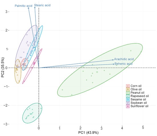 In addition, the quantitative data of the four fatty acids were analyzed by PCA to give an intuitive visualization of the distribution of 93 oil samples. In the PCA analysis, the quantitative data of the four fatty acids in 93 oil samples were normalized with mean 0 and variance 1. The top two principal components were extracted for visualizing the distribution of different oil samples, as shown in Figure 4. Three kinds of edible oils (rapeseed oil, peanut oil, and sunflower oil) were in their own completely independent population. The 13 brands of rapeseed oils had a high consistency in compact category. While different brands of peanut oils showed a degree of dispersion, they had distinct distinguishing features with other oils. The sunflower oils also showed a clear independent category. Three kinds of oils (corn oil, olive oil, and sesame oil) were located on their own separate groups. However, the dispersion of 15 brands of soybean oils was relatively large and crosslinked with three oil groups (corn oil, olive oil and sesame oil). Overall, each kind of oil shows distinct categorical features. This analysis demonstrated that the quantitative analysis of the four fatty acids is effective to distinguish different kinds of edible oils.