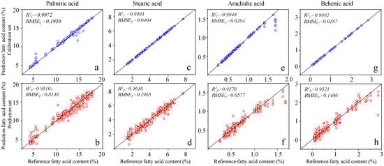The results of palmitic acid on calibration set (a) and prediction set (b) using full wavelengths in the optimal regression model; the prediction results of stearic acid on calibration set (c) and prediction set (d) using full wavelengths in the optimal regression model; the prediction results of arachidic acid on calibration set (e) and prediction set (f) using full wavelengths in the optimal regression model; the prediction results of behenic acid on calibration set (g) and prediction set (h) using full wavelengths in the optimal regression model. (: coefficient of determination in calibration set; : coefficient of determination in prediction set; : root mean square error in calibration set; : root mean square error in prediction set).