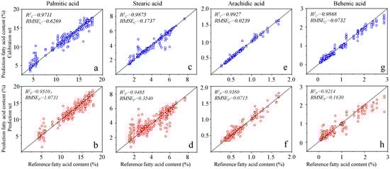 The results of palmitic acid on calibration set (a) and prediction set (b) using the selected wavelengths in the optimal regression model; the results of stearic acid on calibration set (c) and prediction set (d) using the selected wavelengths in the optimal regression model; the results of arachidic acid on calibration set (e) and prediction set (f) using the selected wavelengths in the optimal regression model; the results of behenic acid on calibration set (g) and prediction set (h) using the selected wavelengths in the optimal regression model. (: coefficient of determination in calibration set; : coefficient of determination in prediction set; : root mean square error in calibration set; : root mean square error in prediction set).
