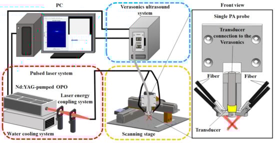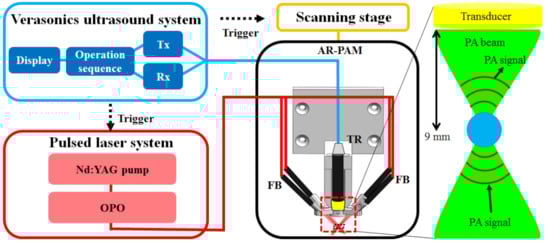 The setup and operation sequence of our AR-PAM imaging system are shown in Figure 1 and Figure 2, respectively, and a detailed system block design is shown in Figure 3. For dual-modality PA/US imaging, the Verasonics high-frequency US platform (Vantage 128, Verasonics Inc., Washington, DC, USA) was employed and controlled by a custom-developed toolbox based on MATLAB® (R2007a, Mathworks Inc., Natick, MA, USA). For the PA imaging mode, a trigger must be provided, which synchronizes the laser excitation and data acquisition. To efficiently collect transcranial PA signals from cortical blood vessels, the PA signals were acquired by a custom-built, large-numerical-aperture, wideband, 50 MHz US transducer []. This transducer had a −6 dB fractional bandwidth of 57.5%, a focal length of 9 mm, and a 6 mm active element. For excitation, the laser used was a compact Nd:YAG laser system with an integrated tunable OPO (SpitLight 600 OPO, InnoLas Laser GmbH, Krailling, Germany). Approximately 7 ns pulses at a 20 Hz repetition rate with a tunable wavelength of 680–2400 nm were generated by the OPO.