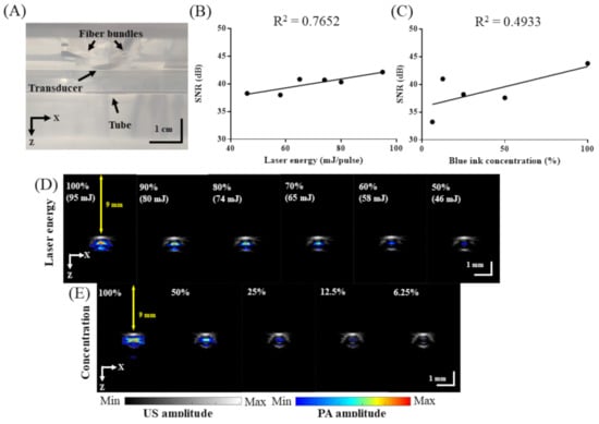 Testing of the in vitro imaging performance of our adjustable AR-PAM system. (A) Experimental setup in the water tank. (B) SNR of PA signals acquired while varying the energy of 750 nm wavelength excitation. (C) SNR of PA signals acquired while varying the blue ink concentration (100%, 50%, 25%, and 12.5% with saline). (D) Overlaid B-scan US/PA images corresponding to (B). (E) Overlaid B-scan US/PA images corresponding to (C).