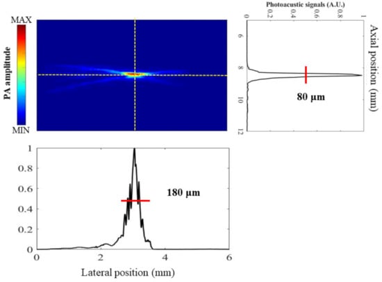 Figure 5 shows the results of measuring the axial and lateral resolutions at a depth of 8.95 mm using a 6 μm-diameter carbon fiber. An axial resolution of 80 ± 5 μm and a lateral resolution of 180 ± 32 μm were obtained. Additionally, a comparison of PA signals from blue and red inks is shown in Figure 6. Tubes were scanned at wavelengths of 700, 750, 800, and 850 nm. The difference in PA signal amplitude between blue and red inks is maximal with an excitation wavelength of 700 nm and negligible for wavelengths of 800 nm and above (i.e., 850 nm). This result is similar to measurements of the absorption spectra of oxygenated and deoxygenated hemoglobin except that the absorption of oxygenated hemoglobin is stronger than that of deoxygenated hemoglobin at 850 nm []. Thus, blue and red inks in a tube phantom can be used as a simple initial model for blood vessels, but using animal blood would be a more accurate model.