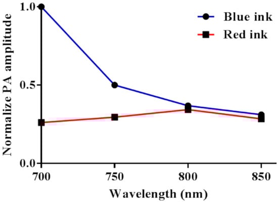 Blue and red inks in tubes were used to mimic oxygenated and deoxygenated hemoglobin in blood vessels without having to set-up a more complicated flow system with oxygenation control and animal blood []. We tested different excitation wavelengths within the range used for in vivo imaging (700–850 nm). Blue or red ink (Lion Pencil Co., Ltd., New Taipei City, Taiwan) was first added to the tube phantom described in Section 2.3. To mimic light scattering when imaging tissue in vivo, the tube was submerged in water containing 5% Intralipid. Then, PA signals were collected and normalized by the laser power to account for fluctuations in the laser output. The normalized amplitude was plotted against the wavelength. For each excitation wavelength, 10 PA signals were collected and averaged.