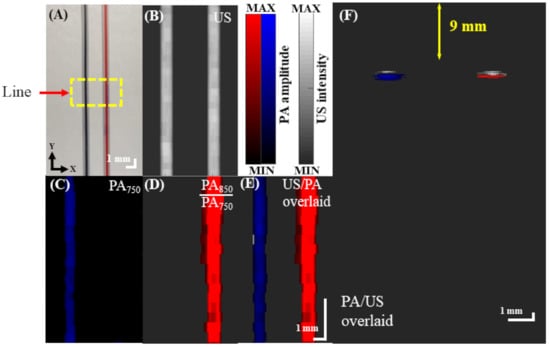 An ink-filled tube phantom experiment was used to assess the volumetric imaging capability of our adjustable AR-PAM system [], as illustrated in Figure 7A. As only a planar image is acquired at one depth, the compact PA probe had to be moved in the depth direction to acquire a volumetric image, which was displayed in two dimensions as a maximum amplitude projection (MAP) image. The subsequent US, PA, and overlaid US/PA MAP images of the ink-filled tube phantom are shown in Figure 7B–E. In the PA MAP images, the optical absorption characteristics of each tube were distinguishable between two excitation wavelengths (i.e., 750 and 850 nm) (Figure 7C,D) [], which was not the case for the US MAP image (Figure 7B). The PA signal of the blue tube was dominant at 750 nm (Figure 7C), while the PA signals of both tubes were similar at 850 nm. To distinguish the red tube from the blue tube, the proportional difference (PARed = PA850/PA750) between the two excitation wavelengths was calculated for each pixel of the image (Figure 7D) []. In addition, the US and PA MAP images are overlaid in Figure 7E, and Figure 7F shows a PA B-scan image of the tubes at the position labeled “line” in Figure 7A. Here, the US image is represented in grayscale, whereas the PA images are represented in blue/red scale. The resulting image simultaneously visualizes the optical absorption characteristics of the ink-filled tube phantom and provides structural information. This demonstrates the feasibility of imaging oxygenated vs. deoxygenated hemoglobin in vivo by using 750 nm excitation to visualize deoxygenated blood and the PA850/PA750 signal to visualize oxygenated blood.