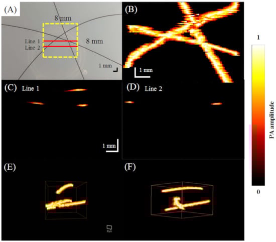 Figure 8A shows a stereomicroscopic image of the phantom with three hairs embedded for an 8 mm × 8 mm ROI []. With the overlapping hairs, the hair phantom had increased complexity compared to the tube phantom and was scanned to demonstrate the 3D imaging capabilities of the AR-PAM system. The corresponding PA MAP image of the ROI is shown in Figure 8B. Structural information of the hairs is visualized in Figure 8C,D, which show the PA B-scan images at Lines 1 and 2, respectively, depicted in red in Figure 8A. Figure 8E,F show example 3D PA C-scan images of the hair phantom. The overlapping hairs could be resolved in the z-direction.