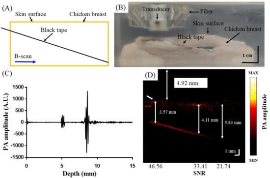To test the tissue imaging performance of the AR-PAM probe in vitro, black tape was inserted into chicken breast tissue, as shown in the schematic in Figure 9A. A photograph of the setup is shown in Figure 9B. Figure 9C shows the PA A-scan signal and PA B-scan image (Figure 9D) obtained by the developed adjustable AR-PAM. The black tape could be visualized to a depth of 5.83 mm beneath the tissue surface. The SNRs at imaging depths of 3.57 mm, 4.11 mm, and 5.83 mm were 46.56, 33.41, and 21.74, respectively. With laser light scattering and interference from the chicken tissue, the tape could still be visualized ~9 mm from the probe surface. The results of these in vitro imaging experiments indicate that the present imaging system can visualize blood vessels with diameters of a few hundred micrometers located at least 9 mm below the surface of the transducer.
