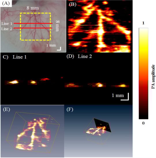 A photograph of the imaged area is shown in Figure 10A. With a step size of 80 μm, approximately 180 min was needed to acquire unidirectional B-scan images of the 8 mm × 8 mm area. The MAP image is shown in Figure 10B. Figure 10C,D show the PA B-scan images of Lines 1 and 2, respectively, shown in red in Figure 10A. The results of this experiment suggest that the spatial resolution and sensitivity of our developed AR-PAM are suitable for imaging blood vessels ~100 µm in diameter in vivo.