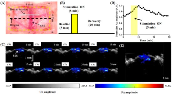 PA B-scan images of the SSS area obtained using an 800 nm excitation wavelength during electrical stimulation of the left forepaw are shown in Figure 11. After craniotomy (Figure 11A), the changes in cerebral hemodynamics induced by left-forepaw stimulation were imaged according to the schematic in Figure 11B. First, a 300 s baseline was recorded. Next, electrical stimulation was applied for 60 s. Last, a recovery period of 1200 s was recorded. The US/PA-overlaid B-scan images are shown in Figure 11C. Figure 11D shows the normalized PA amplitude at various time points over the entire signal recording period (i.e., before and during stimulation and during the recovery stage). The yellow rectangle indicates the 60 s “Stimulation ON” period. The cerebral hemodynamics in the blood vessels of the SSS were monitored in real time in a rat brain with 800 nm excitation (Video S5). The PA signal in the SSS region increased during stimulation and decreased after turning the stimulation off []. This is consistent with stimulation of the forepaw, which increases neural activity in the sensory motor region of the brain. Increased neural activity leads to increased blood flow to the area. Once the stimulation is turned off, blood flow returns to the baseline, as neural activity also returns to the baseline. Our AR-PAM system can detect changes in cerebral blood flow due to functional stimulation that occurs on the scale of minutes.