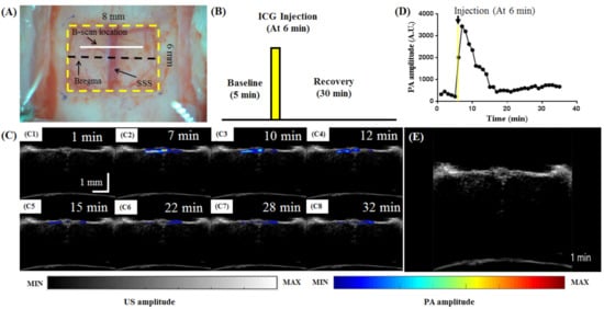 Figure 12 shows the in vivo-obtained PA810 B-scan images of cerebral pharmacokinetics at bregma + 1 mm following ICG injection. A craniotomy was performed to monitor the surgical area (Figure 12A). Data were collected according to a block design paradigm (Figure 12B) involving an ICG injection. The task began with a baseline state applied for 5 min. Then, ICG was injected 1 min later (i.e., 6 min after the onset of the baseline state), after which the rat was monitored for 30 min, which included the recovery time. Representative PA B-scan images acquired before, during, and after ICG injection are shown in Figure 12C. The arrow in Figure 12D indicates the time at which ICG was injected (i.e., 6 min after the onset of the baseline period). The PA signal increased after ICG injection and subsequently decreased over time []. The PA signal returned to near the baseline level, as expected as ICG mainly binds to plasma proteins and does not extravasate in healthy rats with an intact blood–brain barrier []. A video of the changes in the PA signal is included (Video S6) to visualize the ICG brain pharmacokinetics. This result demonstrates that our AR-PAM system can be used to monitor ICG kinetics in the brain. Diseases such as tumors, stroke, or cerebral trauma can cause changes to cerebral blood flow and disruption to the blood–brain barrier. By incorporating these disease models in future studies, the comparison of ICG kinetics with those in normal controls can be explored as a disease marker.