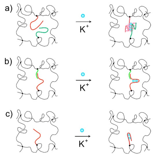 Schematic illustration of potassium aptamer sequence structures and their integration in hydrogels for label-free biosensing. (a) Oligo-3; (b) KLM-L; (c) KLMss.