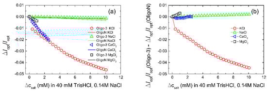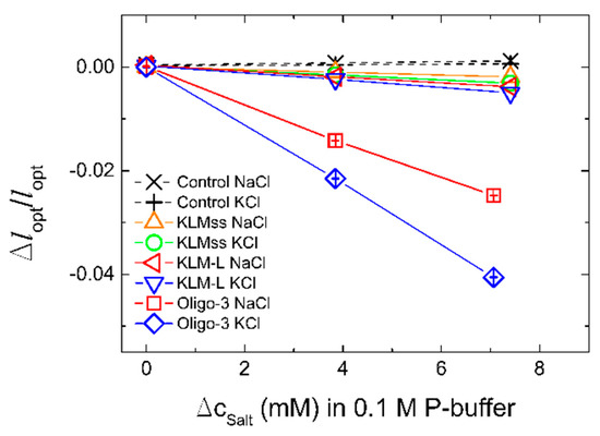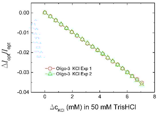 The standard deviations of the relative change of the optical length Δlopt/lopt in the case of oligo-3-co-AAm sensor determined at increasing NaCl and KCl to the buffer (Figure 2) were observed to be of the order up to 5 × 10−5. The graphical presentations of these uncertainties were found to be included within the size of the symbols used (Figure 2), and also in the case of all equilibrated data points (Figure 2, Figure 3 and Figure 4 and Figure 6). Repeated exposure of the oligo-3-co-AAm hydrogel to increasing KCl in the immersing aqueous solution shows similar deswelling behavior (Figure 3). In this experiment, the hydrogel sensor was washed in buffer (50 mM Tris, pH 7.4, without KCl) after completion of the first series. This indicates that the K-induced changes in this oligo-3-co-AAm hydrogel are reversible.