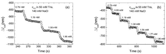 Optical length of the sensor versus time for stepwise 0.794–1.962 mM increase in (a) KCl and (b) CaCl2. Tran-sient swelling when K+ ions are added is slower as a result of the influence of the kinetics of folding of the aptamer, compared to Ca2+ ions addition.