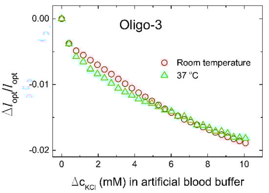 In order to test whether the designed biosensor has good selectivity, we introduced Na+, Tris-HCl buffer (50 mM, pH 7.4, 140 mM NaCl), as the most common potential interfering ions with this type of aptamer. As presented in Figure 4, the influence is negligible. We therefore proceed by evaluation of the selectivity of the oligo-3-co-AAm sensing element in a solution closer to an application by using an artificial blood buffer at room temperature and temperature of the human body (37 °C). Results showed negligible influence of the temperature on the biosensor performance (Figure 6). The sensor yielded a relative deswelling signal up to −2% at 10 mM K+ added to the artificial blood buffer, which is significantly less than the K+ sensitivity recorded in Tris-HCl buffer (50 mM, pH 7.4, 140 mM NaCl). Possible factors that may contribute to such a difference in sensitivity is that presence of BSA in the artificial blood buffer may affect the level of accessible K+ for the oligo-3 aptamer. In this perspective, it is reported that ions interact with proteins, including transport proteins like albumin, but the proteins generally interact stronger with Na+ than K+. The sensor is tested in environmental conditions of the human blood serum due to the clinical relevance for ICU patients. Furthermore, the sensor could be used in other mediums such as urine, sweat, or wherever potassium tracking is needed. A further perspective is the need for calibration of the actual sensor before a possible development line towards a clinical proof of concept. In this regard, the relative deswelling signal and its uncertainties for the potassium selective response of the oligo-3-co-AAm sensor in artificial blood buffer can be used to provide a limit of detection (LoD). The standard deviations of the Δlopt/lopt data in artificial blood buffer are observed to be up to 6 × 10−5. Accounting for baseline noise at the same level and using three times standard deviation as basis for estimate of LoD, we obtain a LoD of 0.14 mM K+ for this particular sensor when used in artificial blood buffer. For the characterization of the sensor in Tris buffer (Figure 4), where the response is larger at the same concentration of K+, the LoD will be less, typically half the value of that stated for the artificial blood buffer. These estimates indicate that the sensor is capable to provide good resolution in the determination of K+, but one should also be aware that further optimization of the hydrogel material with respect to composition (e.g., the ratio between K+ aptamer-supported crosslinks and covalent ones) similar to that reported in previously [39], can be possible.