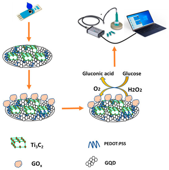 Preparation of PEDOT:PSS/Ti3C2/GQD of 1:1:1 (v/v/v) ratio was mixed and sonicated at 30 °C for 10 min. Then, the nanocomposite material was stored overnight (24 h) at room temperature. Subsequently, 3 µL of PEDOT:PSS/Ti3C2/GQD nanocomposite was uniformly drop-cast onto the electrode surface of the SPCE and left to dry (2 h) at room temperature. Prior to the modification phase, the electrode is activated by CV for approximately 50 cycles in KCl at a scan rate of 100 mV/s. Next, 3 µL of 0.1 M GOx was immobilized on the modified SPCE and left for two hours to dry. After the enzymatic layer was formed, the electrode was rinsed with a stream of a phosphate-buffered solution to remove the residual monomer and weakly linked enzyme molecule prior to taking the measurements. A schematic diagram of PEDOT:PSS/Ti3C2/GQD/GOx modified SPCE glucose biosensor is illustrated in Figure 1. The detection mechanism of the developed biosensor in this study can be classified as a third-generation glucose biosensor which is capable of direct electron transfer, providing an electrical signal to be measured.
