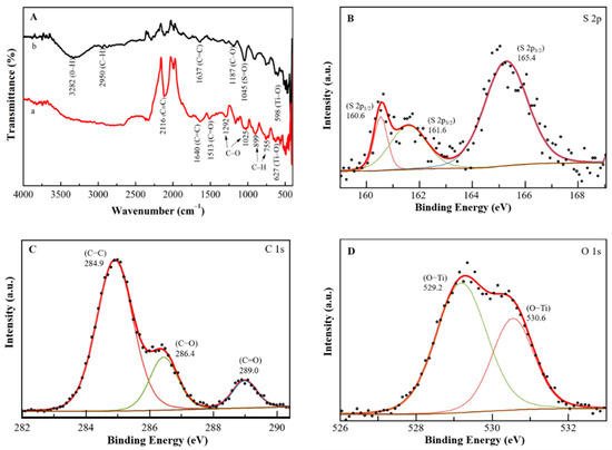 Subsequently, the chemical constitution and the structure of the PEDOT:PSS/Ti3C2/GQD were investigated by X-ray photoelectron spectroscopy (XPS). The general survey of the XPS spectrum of the PEDOT:PSS/Ti3C2/GQD shows three strong binding energy peaks at 165.4, 284.9 and 530.6 eV were attributed to S 2p, C 1s, and O 1s, respectively (S1). The PEDOT:PSS/Ti3C2/GQD were composed of S (1.56%), C (78.81%), and O (19.63%), especially, in the high-resolution spectrum of S 2p (Figure 2B), where there were two peaks at 160.6 (0.09%) and 161.6 (0.49%) which were attributed to S 2p3/2, and one peak at 165.4 (1.03%) eV which was attributed to S 2p1/2 species, respectively. Three remarkable peaks in the C 1s spectrum at 284.9 (58.26%), 286.5 (13.32%), and 289.0 (5.56%) eV (Figure 2C) were attributed to C-C, C-O, and C=O groups. In the O 1s spectrum (Figure 2D), two peaks at 529.2 (13.61%) and 530.6 (7.63%) eV both were attributed to O-Ti groups, indicating the presence of Ti bonding by MXene [25,26].