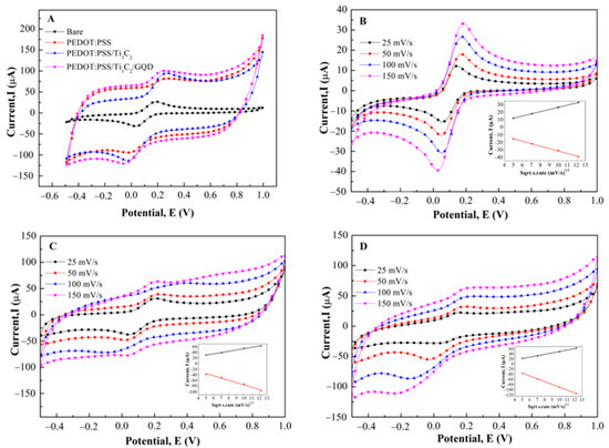 In addition, the effect of scan rates (from 25 to 150 mVs−1) on the peak currents at PEDOT:PSS/Ti3C2/GQD electrode was investigated. As can be seen in Figure 4B–D, the plot of the square root scan rate vs. peak current of bare SPCE, PEDOT:PSS/Ti3C2, and PEDOT:PSS/Ti3C2/GQD (inset) exhibited a linear calibration with coefficient regression of 0.9999, 0.9895, and 0.9953 respectively, showed that the process is diffusion-controlled [28]. Moreover, by using the Randles–Sevcik equation, the calculated effective surface area for bare SPCE, PEDOT:PSS/Ti3C2, and PEDOT:PSS/Ti3C2/GQD were 0.013 cm2, 0.021 cm2, and 0.026 cm2, respectively. Compared to bare SPCE, the effective surface area (A) of PEDOT:PSS/Ti3C2 was significantly enhanced by about 62% compared to bare SPCE. This suggested that the increment of the electroactive surface was largely attributed to PEDOT:PSS/Ti3C2.