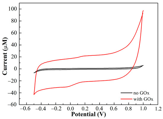 The CVs of PEDOT:PSS/Ti3C2/GQD electrode in 0.1 M ammonium acetate solution (pH = 7.0) in the presence and absence of 500 µM glucose oxide are recorded in Figure 5. It can be seen that a small oxidation and reduction peak was observed after the addition of GOx, which can be attributed to the consumption of O2 in ammonium acetate solution, which resulted in the redox process [29].