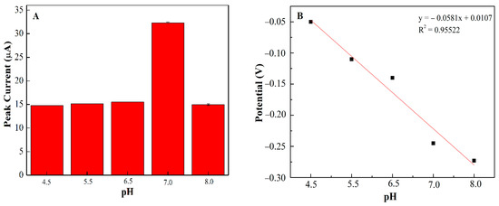 In order to examine the idyllic pH for glucose detection at PEDOT:PSS/Ti3C2/GQD SPCE, different pH buffer solutions (pH 4.5–pH 8) have been investigated using DPV and CV, respectively [30]. Figure 6A shows the influence of pH on the developed biosensor, the results reveal that pH 7.0 has the highest peak oxidation current suggesting the optimum for enzyme activity in this study [30]. In addition, above pH 8.0, the oxidation peak current decreased significantly which might be due to denaturation and a loss in enzyme activity [31]. Therefore, the ammonium acetate solution at pH 7.0 was selected for further investigation of PEDOT:PSS/Ti3C2/GQD/GOx SPCE. Moreover, in most cases, the redox behaviors of GOx are often greatly dependent on the solution pH. In this study, a negative shift of both the redox peak potentials of GOx appeared when the pH value of the solution increased. The formal potential (E0′) showed a good linear function with pH solution in the range of 4.5–8.0 where the linearity for glucose detection has been confirmed by the peak potential plot in Figure 6B. The acquired slope value was found to be 58.1 mV per pH unit, following the Nernst equation [32], which confirms the same number of protons and electrons involved in the PEDOT:PSS/Ti3C2/GQD SPCE mechanism [33].