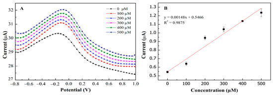 The concentration of glucose detection with linear range 0−500 µM at SPCE/PEDOT: PSS/Ti3C2/GQD−GOx, (A) DPV analysis for 0–500µM of glucose; (B) linearity of glucose concentration vs. current oxidation peak (Ipa).