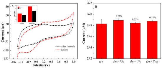Repeatability studies of the developed sensor were measured using cyclic voltammetry (CV). A concentration of 500 µM glucose demonstrates a good current signal with 4 consecutive cycles using the same electrode with a relative standard deviation (RSD) of 2.05%. The steady-state current was still sustained at 90% of its initial response (Figure 8A). This means that a slight change in the oxidation-reduction peak was observed (Figure S2). The repeatability values are considered acceptable for four replications [41]. The long-term storage stability of PEDOT:PSS/Ti3C2/GQD with GOx on SPCE was also investigated. After one-month storage at ambient conditions, a slight decrease in the anodic and cathodic peak current [42] was observed (Figure 8A). The anodic and cathodic peak current was still retained above 81% and 72% of its initial response after one month (Figure 8A). The result shows that GOx is not leaching on the electrode surface even after 1 month. This suggested that the fabricated biosensors had outstanding storage stability and durability for analyte sensing in the free solution.