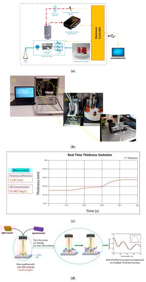 - Koukouvinos, G.; Goustouridis, D.; Misiakos, K.; Kakabakos, S.; Raptis, I.; Petrou, P. Rapid C-reactive protein determination in whole blood with a White Light Reflectance Spectroscopy label-free immunosensor for Point-of-Care applications. Sens. Actuator B 2018, 260, 282–288. [Google Scholar] [CrossRef]