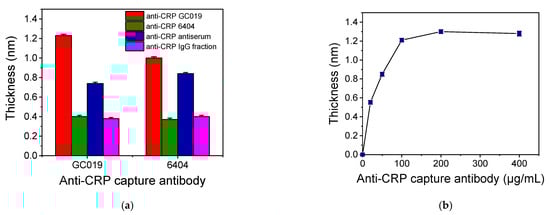 (a) Sensor responses obtained for a calibrator containing 100 ng/mL CRP using biochips coated with two different anti-CRP antibodies (GC019 or 6404) at a concentration of 100 μg/mL in combination with four different detection antibodies all at a concentration 10 μg/mL. Each point is the mean value of three measurements ± SD. (b) Sensor responses obtained for a calibrator containing 100 ng/mL CRP from chips coated with capture anti-CRP antibody at concentrations ranging from 20 to 400 μg/mL. Each point is the mean value of three measurements ± SD.