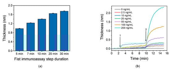 Once the capture and detection antibody concentrations were selected, the duration of each immunoassay step was determined. For this purpose, duration times of 5, 7, 10, 20 and 30 min were investigated for the first assay step keeping the second step duration set at 5 min. As shown in Figure 3a, as the duration of the first immunoreaction step, i.e., the reaction of CRP molecules with the immobilized onto the chip capture antibody, increased, the sensor response increased, reaching plateau values after 20 min of reaction. Nonetheless, the sensor response increased approximately 30% when the duration of the first immunoreaction increased from 7 min to 30 min. In order to investigate if this immunoreaction duration could provide for a wide dynamic range, calibrators with CPR concentration ranging from of 2.5 to 200 ng/mL were run over the biochip for 7 min followed by a 5-min reaction with the detection antibody. The results presented in Figure 3b indicate that in case of high concentration CRP calibrator, i.e., 200 ng/mL, the sensor response obtained during the first step reached the maximum value within approximately 3 min. Regarding the lower CRP concentrations, the response increased continuously and no plateau values were obtained after 7 min of reaction. However, the responses obtained after reaction for 5 min with the detection antibody allowed good discrimination of the calibrators. Thus, a 7 min duration for the first step allowed for a wide assay dynamic range. From the real-time responses presented in Figure 3b, it can be also concluded that, for all CRP calibrators maximum plateau values were obtained for a 5-min duration of the second immunoassay step. In fact, increase of duration of the reaction with the detection antibody from 5 to 10 min resulted in a marginal sensor response increase of about 5%. Therefore, the 5 min duration time of the second assay step was selected for the final protocol, in order to minimize as much as possible, the overall analysis time.