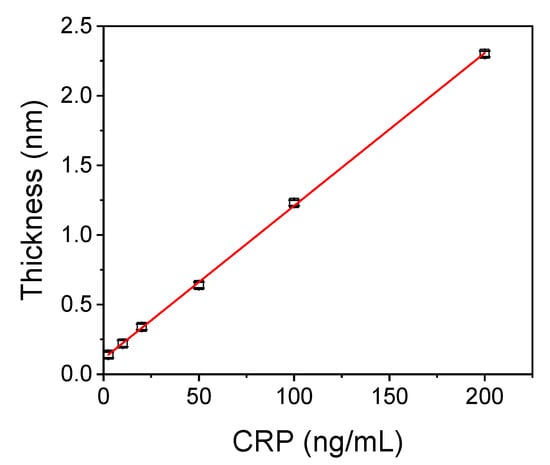 C-Reactive Protein (CRP), a 118 kDa molecular weight protein, is the most established biomarker of inflammation. It consists of five non-covalently bound identical subunits and belongs to the class of acute phase proteins []. The production of CRP is carried out mainly by hepatocytes and it is strongly regulated by the pro-inflammatory cytokines, especially interleukin-6 [,]. While in healthy individuals CRP levels are below 5 μg/mL, they can increase rapidly up to 1000-fold within 24–48 h after the onset of an acute inflammatory condition. Moreover, rapid decrease in CRP levels within the first 48 h of therapy has been correlated with an effective response to the treatment, while persistently high concentrations have been related to high mortality rates [,]. In addition, CRP can be used to distinguish bacterial from viral infection since its levels are much higher in case of bacterial infections, rather than in viral ones. It is also widely used as a biomarker for sepsis diagnosis, which is one of the major mortality causes in critically ill patients [,]. Elevated CRP levels are related to the severity of sepsis and the prognosis of the disease outcome [,]. Moreover, it is the most widely used biomarker for the early detection of sepsis in neonates. In this case, CRP serum concentration rises above 5 μg/mL in about 6 h after stimulation and peaks 48 h after sepsis onset, while studies have demonstrated the importance of repetitive CRP measurements in monitoring the treatment response in infected neonates [,]. Nonetheless, the role of CRP as a biomarker of inflammation extends beyond microbial infections. CRP levels are also significantly elevated in case of trauma, injury and tissue necrosis, diabetes, cancer, and rheumatic diseases [,,]. Moreover, mildly elevated CRP levels at 1–3 μg/mL have been associated with high risk for cardiovascular diseases and acute myocardial infraction [,]. Therefore, the quantitative and accurate determination of CRP concentration in blood samples is one of the most commonly performed test in clinical settings to confirm an inflammatory condition and monitor the patient response to therapy.