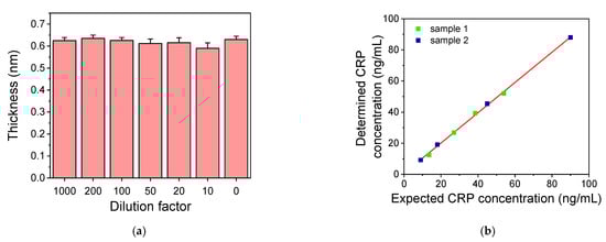 (a) Sensor responses obtained upon running a 50 ng/mL CRP solution prepared in assay buffer or in CRP-free human plasma diluted 10–200 folds with assay buffer. Each point is the mean value of three measurements ± SD. (b) Plotting of CRP concentration values determined in two plasma samples of known concentration after sequential dilution with assay buffer versus the expected CRP values in the diluted samples.