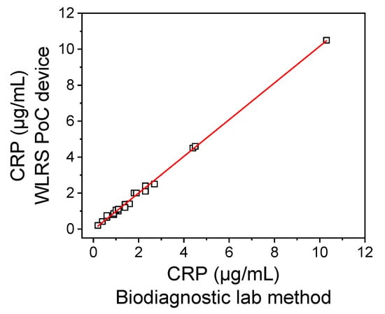 The accuracy of the developed CRP assay was also evaluated by analyzing 20 plasma samples from anonymous donors and comparing the values determined with those provided for the same samples by a diagnostic laboratory method. In Figure 6, the correlation of CRP concentrations determined in the plasma samples by the WLRS device with those measured by the method of the diagnostic laboratory is presented. The equation of the linear regression curve was y = 1.021 (±0.012) x − 0.041 (±0.038) and the correlation coefficient was R2 = 0.996, indicating a very good agreement between the values determined with the developed method and those determined with the diagnostic laboratory method. These results demonstrated the accuracy of the measurements performed using the developed WLRS PoC device in analysis of human plasma samples. It should be noticed that the method developed could be applied for determination of CRP concentration in serum samples with the same accuracy.